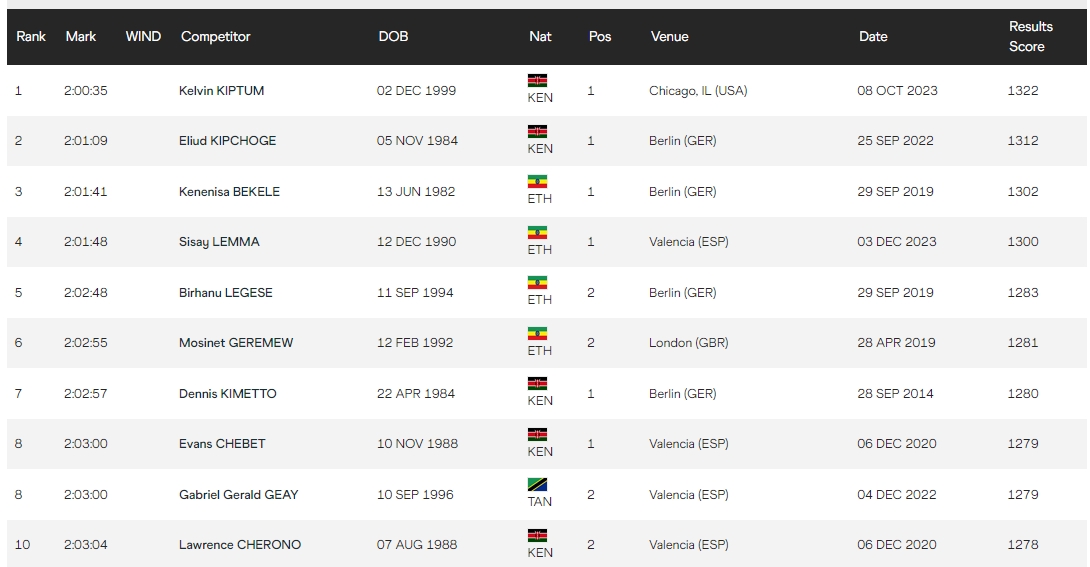 上天嫉妒人才!马拉松历史成绩排名:Kiptum 2小时35秒排名第一
