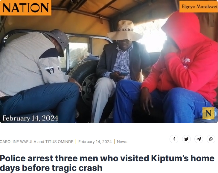 2月14日:肯尼亚当地警方表示,他们拘留了基普图姆生前曾到过他家的三名男子。