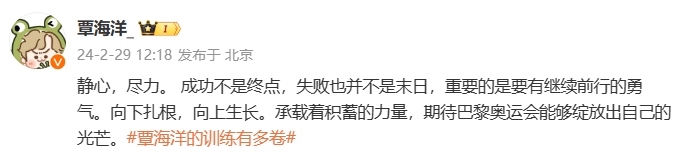 2月29日消息巴黎备战奥运会的游泳运动员秦海洋中国更新了自己的社交媒体。
