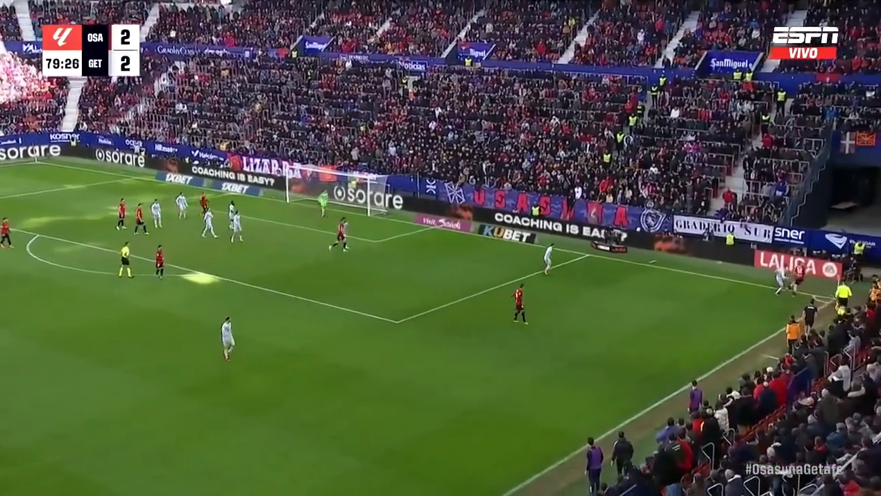第80分钟,阿雷索右路突破,皮球飞向角旗区。皮球划出一道弧线,越过赫塔菲门将,击中远门柱弹入球门。凭借这个进球,奥萨苏纳以3-2击败对手。