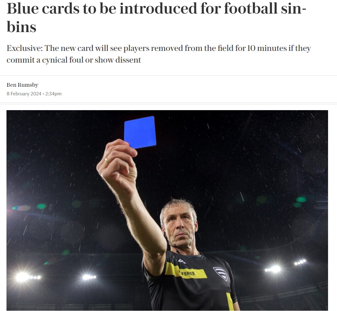 电讯报:足球比赛将引入蓝牌、犯规、破坏性威胁、进攻性抗议将导致10 分钟处罚